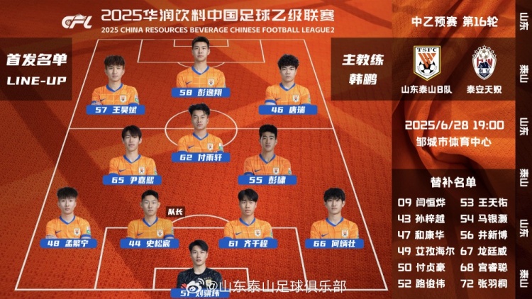 中乙预赛第16轮山东泰山B队主场与泰安天贶队首发阵容